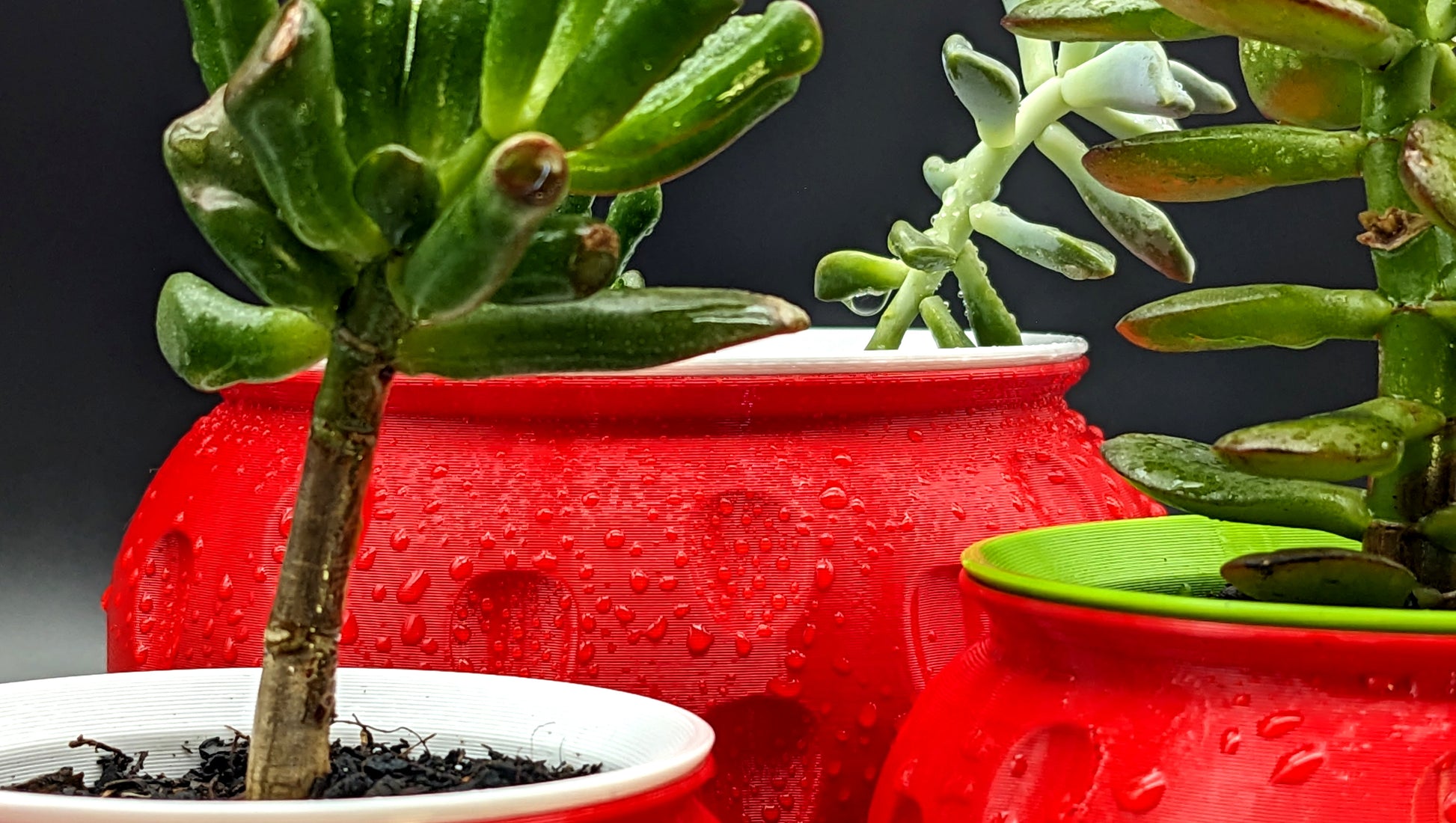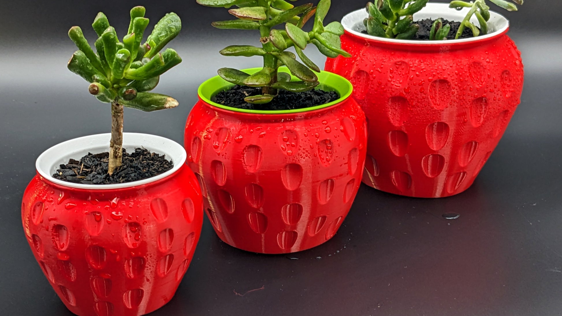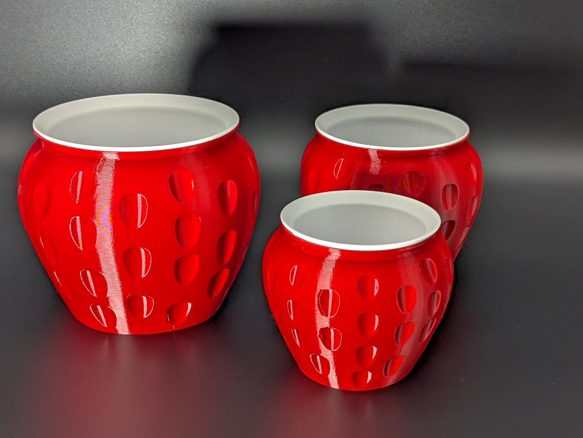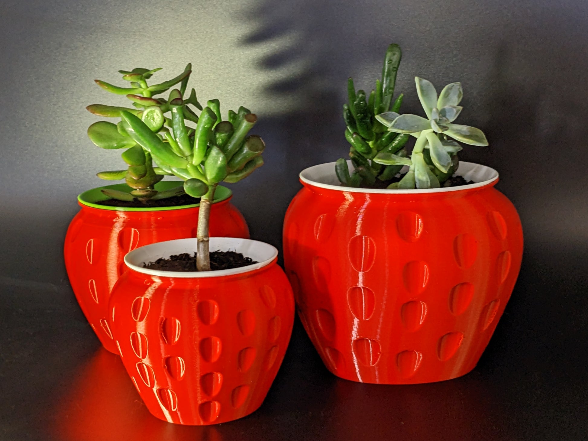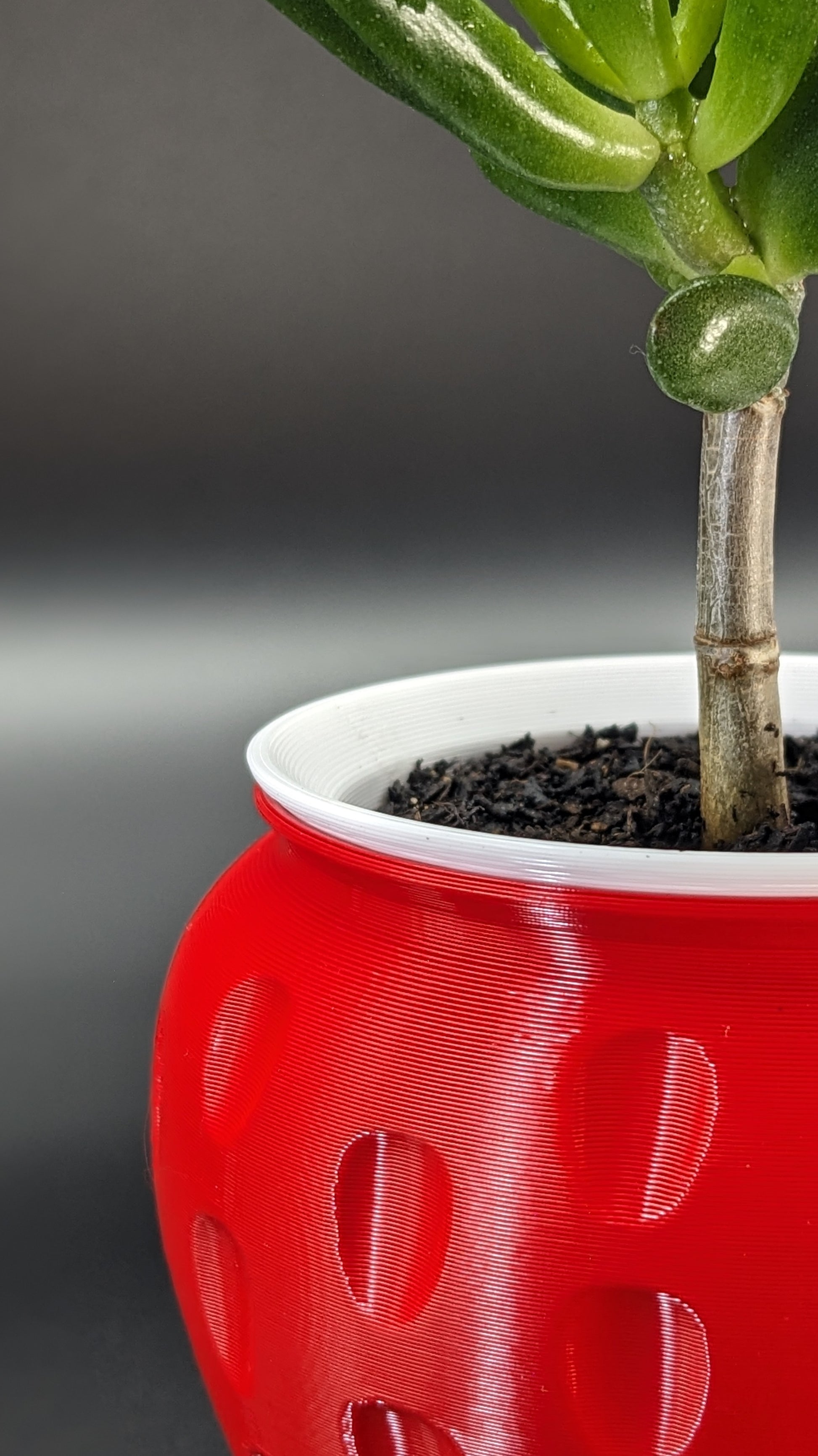 Our Strawberry Feels plant pot captures more than just the iconic shape – it's a study in texture and form that makes you want to reach out and touch it. The dimpled surface plays with light in unexpected ways, creating tiny moments of visual delight as you move around it. It's rather remarkable how industrial materials can capture something so organic, right down to that characteristic strawberry stippling.